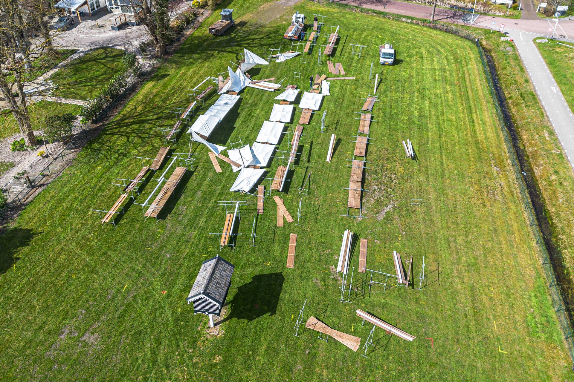 Luchtbeelden tonen de omvang van de schade die door de wind is aangericht. Ondanks dat de windkracht volgens metingen tussen 2 en 4 lag, bleken de windstoten krachtig genoeg om het merendeel van de kramen omver te blazen.
