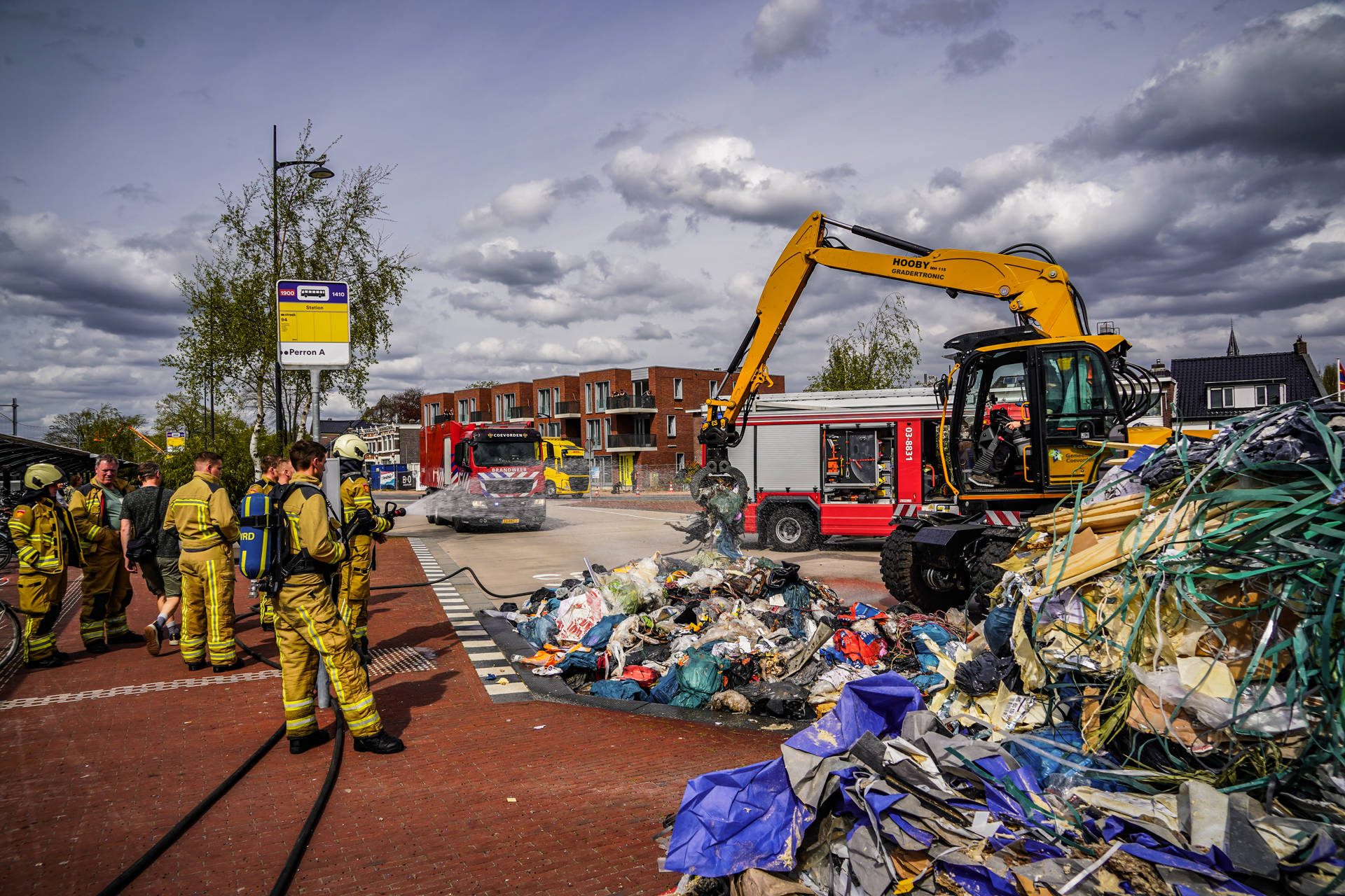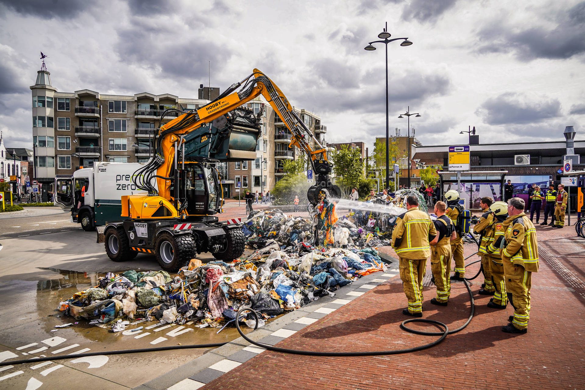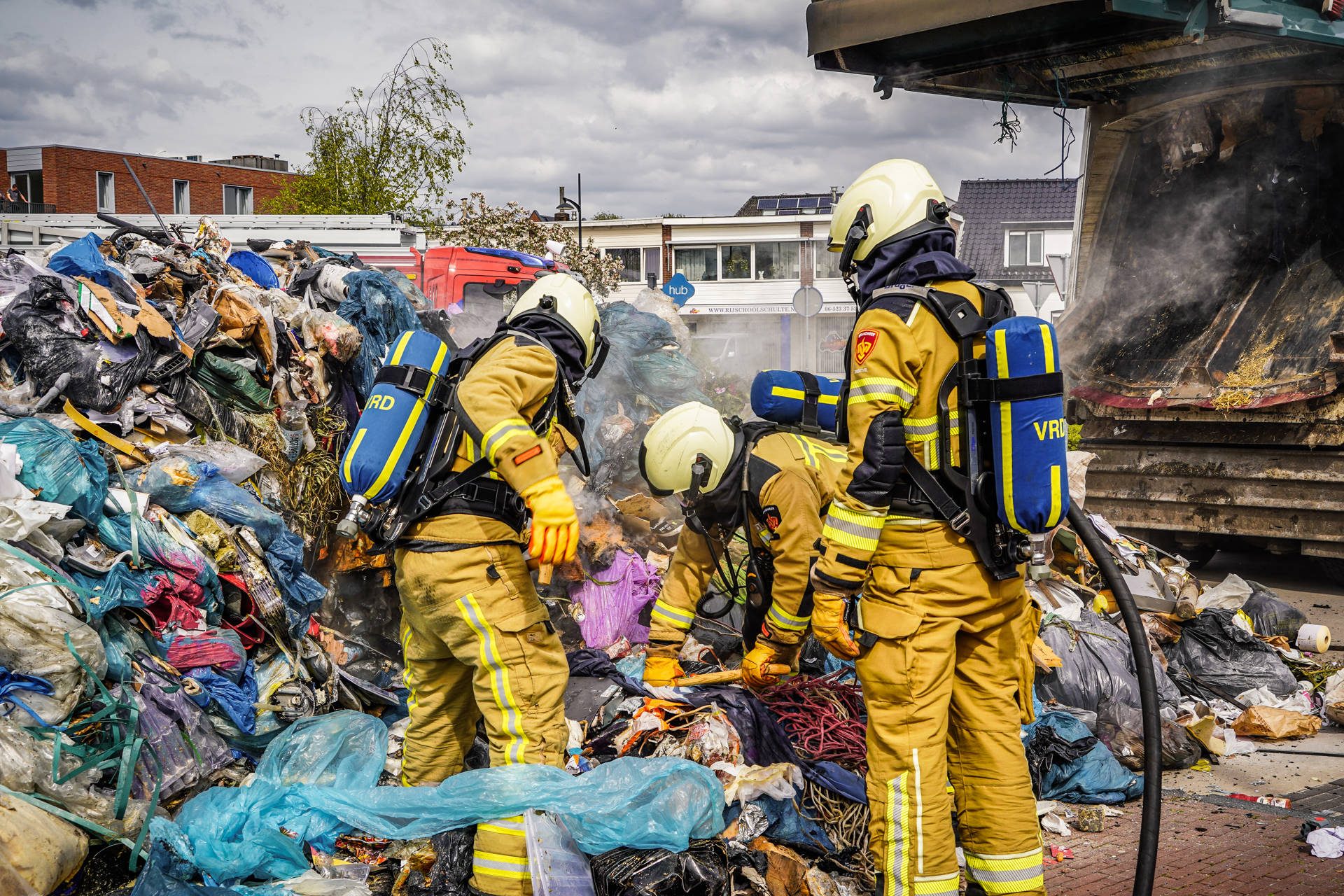 De brandweer van Coevorden kwam met een tankautospuit en een waterwagen ter plaatse. Brandweerlieden zijn bezig met het blussen van de brand en trekken het afval uit elkaar om het vuur goed te kunnen doven.