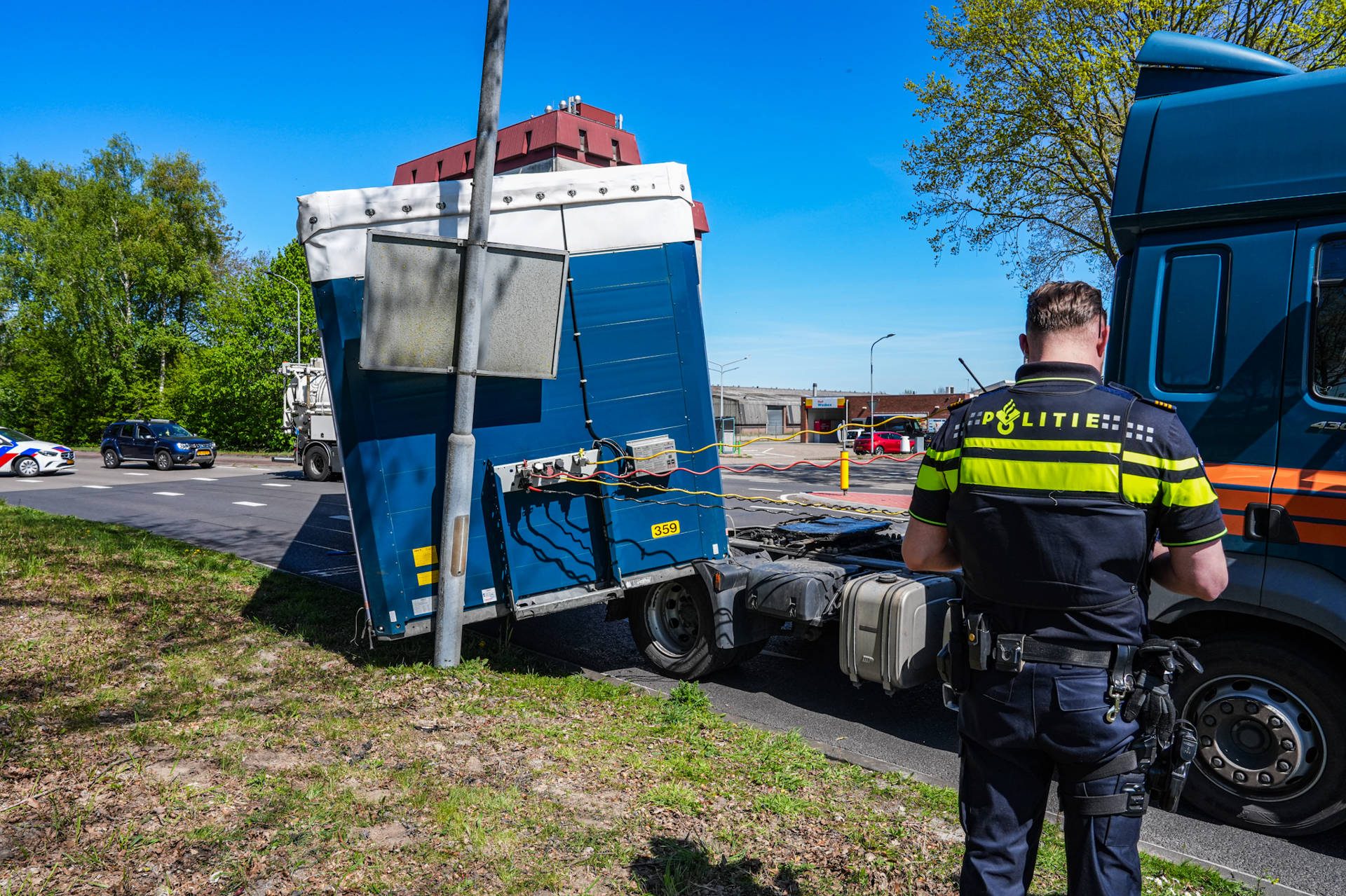 Het ongeval gebeurde toen de vrachtwagen vanaf het Shell tankstation langs de Rondweg terug de Rondweg op wilde. De oplegger schoot los en kwam op het wegdek terecht en tegen een lantaarnpaal.